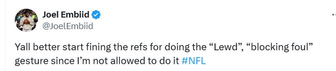 恩比德对这笔罚款并不认同,他在社媒上回应道:“既然我这么做不行,那你们最好也开始罚裁判——他们比手势判‘阻挡犯规’,这也够‘不雅’的。”