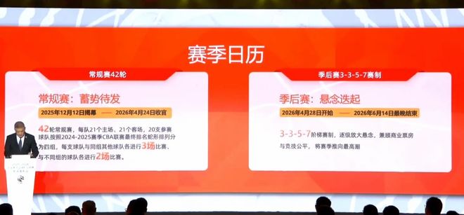 新赛季CBA常规赛将于12月12日正式开始,季后赛实行3-3-5-7的赛制,所有比赛最晚会在2026年6月14日结束。新赛季的CBA全明星周末也确定在浙江省诸暨市的西施篮球中心进行,时间是2026年3月6日至8日。