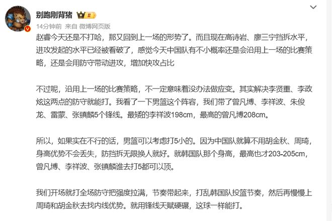 赵睿的缺阵所带来的影响相当大,这一场中国队该如何应付?不妨来看看媒体人“别跑刚背猪”给出的建议:在高诗岩、廖三宁挡拆水平、进攻发起水平已经被看破的情况下,郭士强很可能还会沿用上一轮的比赛策略,用防守带动近,增加快攻占比,但这不一定意味着没办法做应变,其实解决李贤重、李政炫这两点的防守就能打,郭士强带了曾凡博、李祥波、朱俊龙、雷蒙、张镇麟5个锋线。